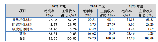 究竟是什么产品让资本市场如此青睐?金戈新材的核心盈利产品为导热粉体材料,2025年,这款产品贡献了公司67.25%的收入,毛利率达27.05%。相比之下,第二大产品阻燃粉体材料26.92%的收入占比,毛利率却仅有8.77%——几乎是在盈亏线上挣扎。