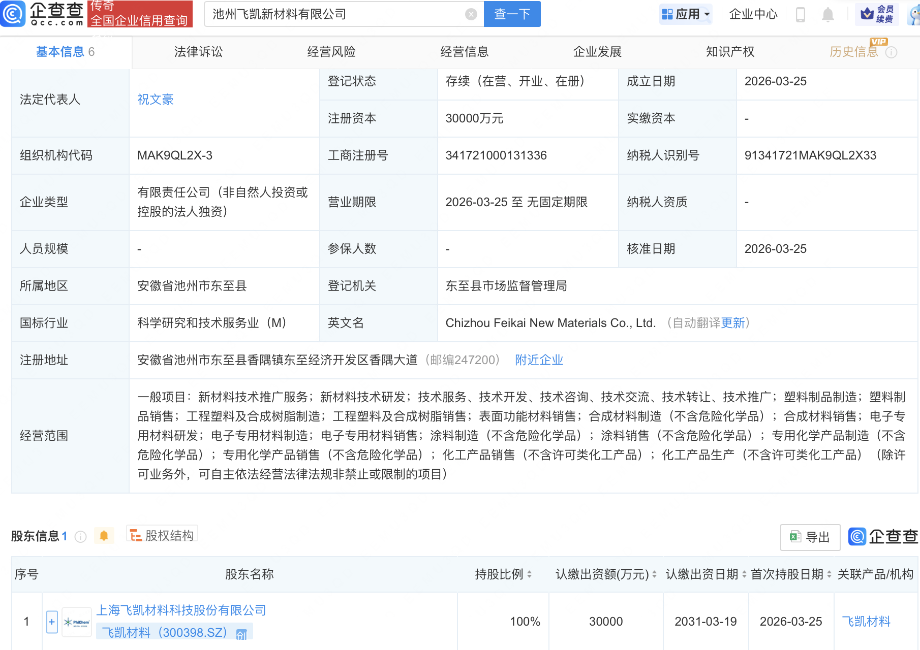 企查查APP显示,近日,池州飞凯新材料有限公司成立,注册资本3亿元,经营范围包含:电子专用材料研发;电子专用材料制造;电子专用材料销售;涂料制造(不含危险化学品)等。企查查股权穿透显示,该公司由飞凯材料(300398)全资持股。