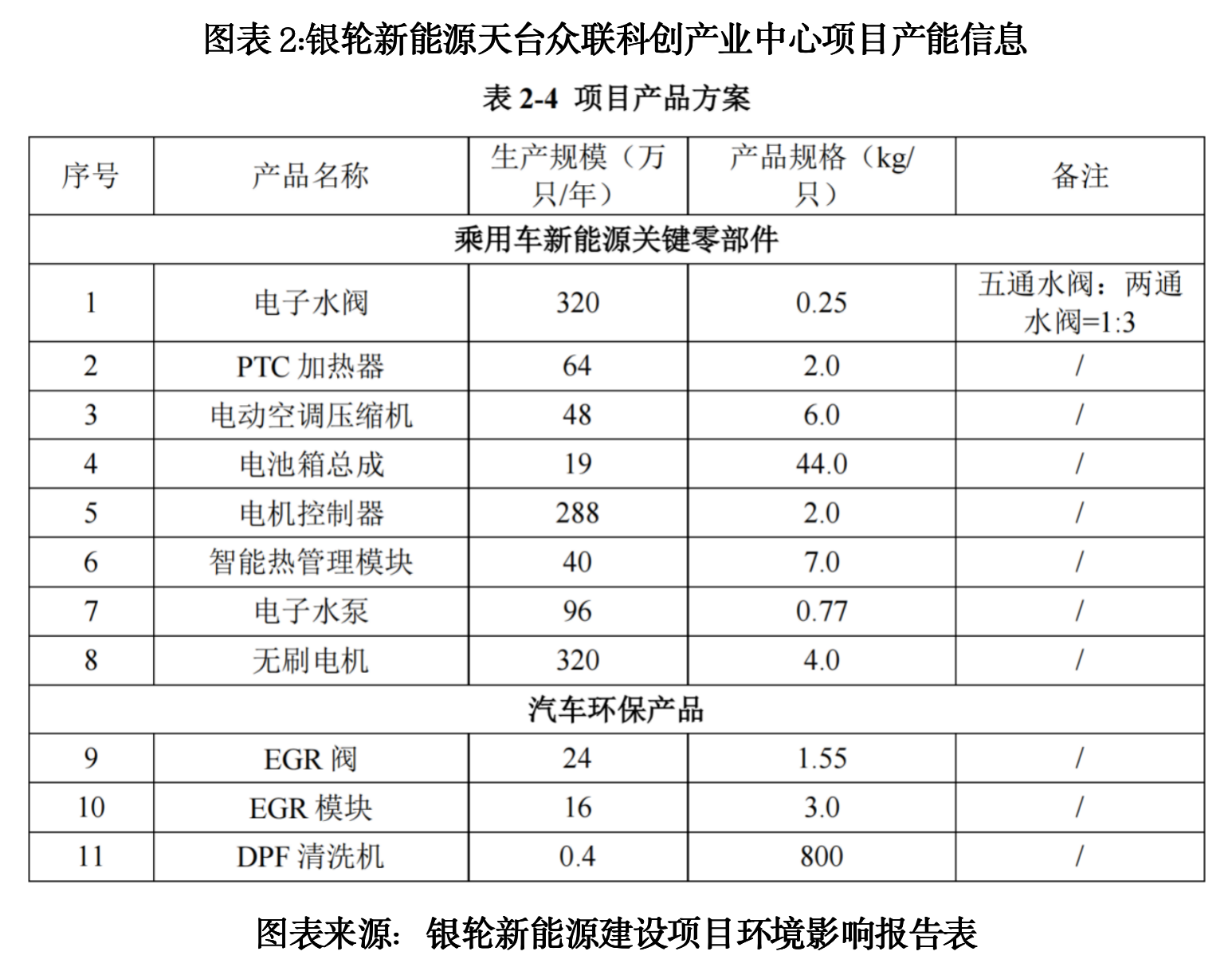 不过,时代商业研究院发现,在浙江省人民政府官网披露的《浙江银轮新能源热管理系统有限公司“天台众联科创产业中心项目——新能源汽车热管理关键零部件及环保产品项目”环境影响报告表全本公开》中,银轮新能源明确披露了电子水泵和无刷电机的产能信息。