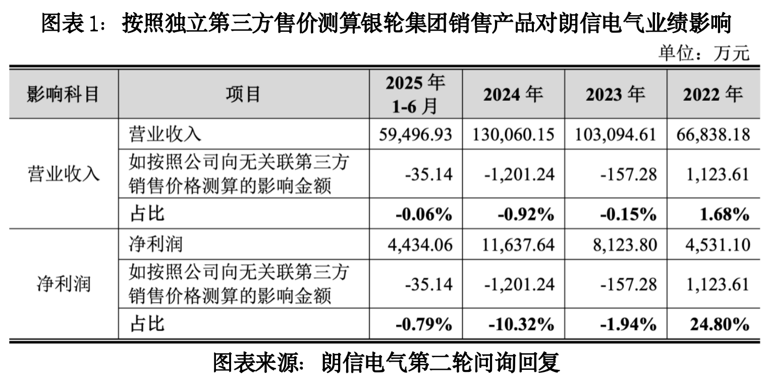 第二轮问询回复文件显示,如按照向无关联第三方销售价格对朗信电气与银轮集团销售产品进行测算,对其报告期各期(2022—2025年上半年)营收的影响比例分别为1.68%、-0.15%、-0.92%、-0.06%,对净利润的影响比例分别为24.80%、-1.94%、-10.32%、-0.79%,对业绩影响波动较大。