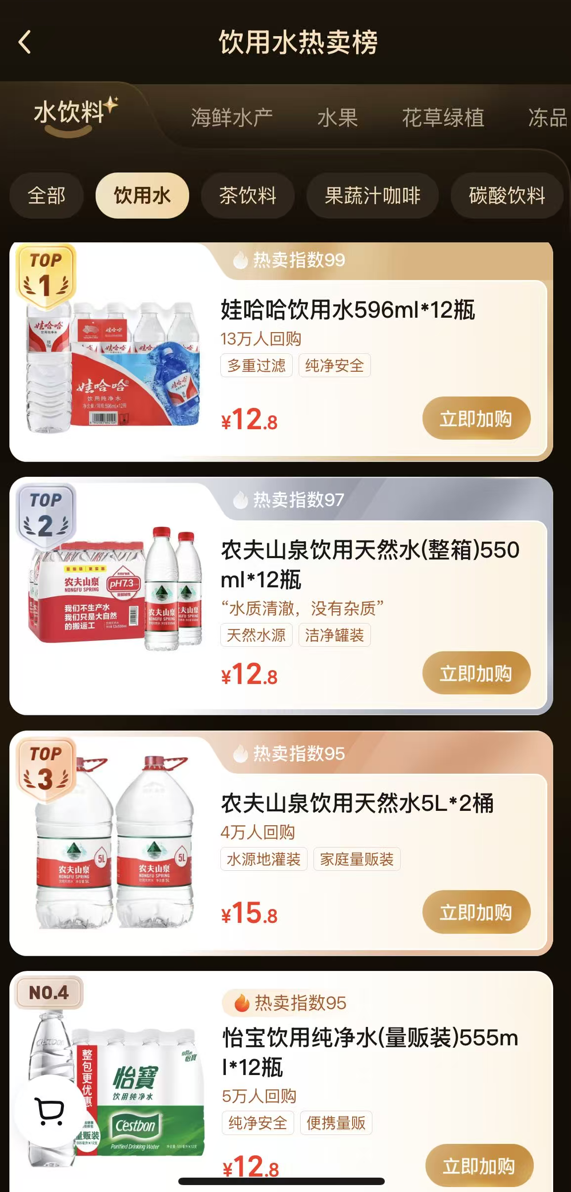 作为怡宝最直接对手的娃哈哈,则通过进入全家、盒马、美宜佳等渠道动作,正式挤进一线市场。小象超市饮用水热卖榜显示,当前,娃哈哈的596ml*12瓶饮用纯净水产品排名第一,而怡宝的饮用纯净水产品则仅排名第四。