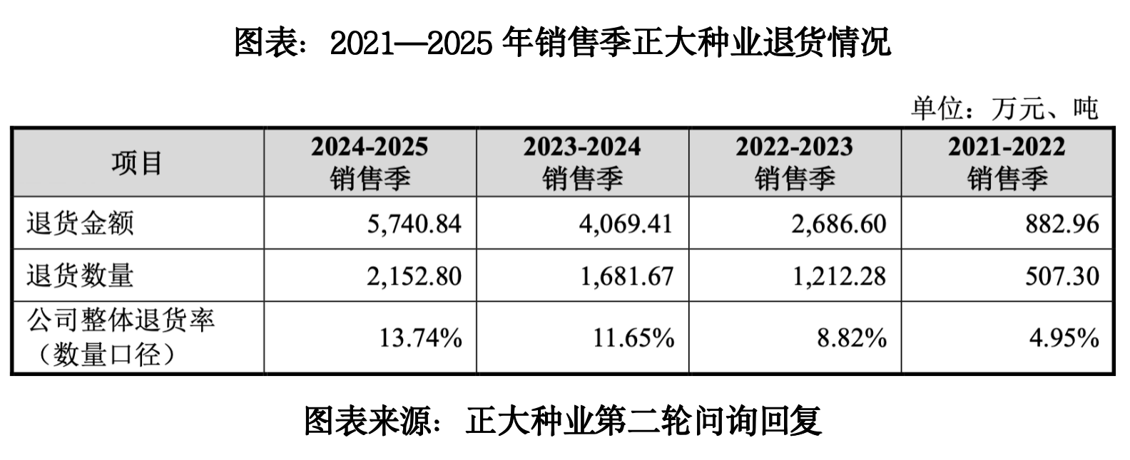 第二轮问询回复文件显示,跟2021—2022年销售季相比,2024—2025年销售季正大种业的退货率从4.95%升至13.74%,退货金额从882.96万元增至5740.84万元。