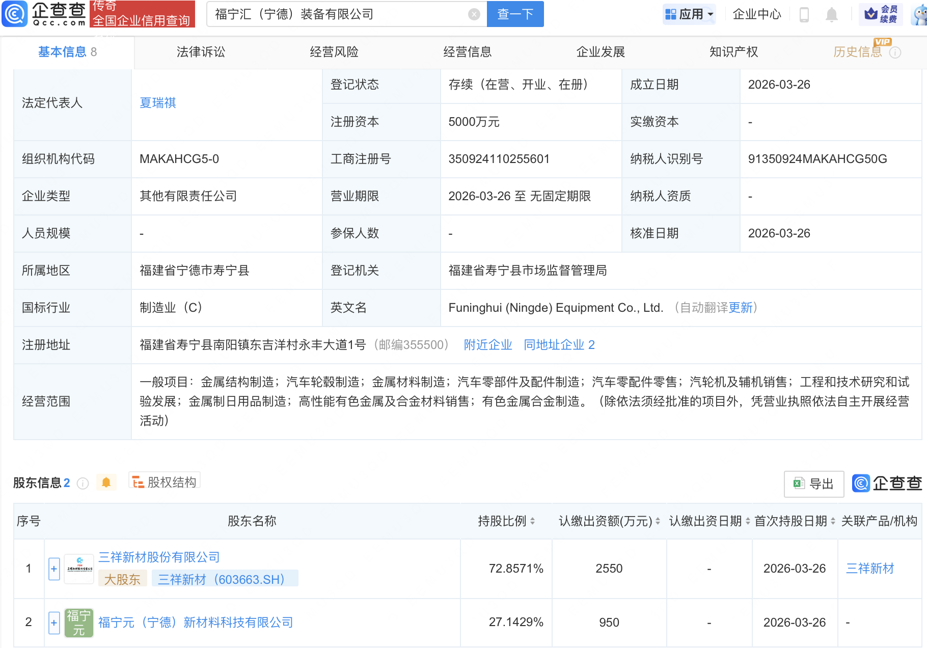 企查查APP显示,近日,福宁汇(宁德)装备有限公司成立,注册资本5000万元,经营范围包含:金属制日用品制造;高性能有色金属及合金材料销售;有色金属合金制造等。企查查股权穿透显示,该公司由三祥新材(603663)等共同持股。