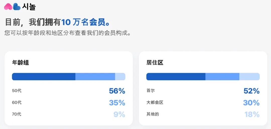不容忽视的是,无论是退休人群规模或是银发经济潜力上,国内都要远超韩国,然而现阶段国内不少面向50岁以上人群的俱乐部或退休组织,多数以微信群维系线上连接,并以线下活动为核心,例如旅行团、兴趣课程以及各类社交活动,但整体模式往往较为分散,缺乏持续运营和维持用户粘性的能力。