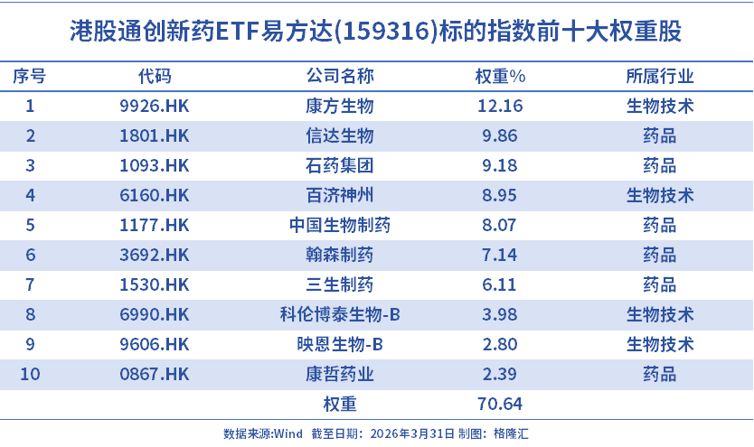 港股通创新药ETF易方达(159316)是市场上目前唯一跟踪恒生港股通创新药指数的产品,该指数在编制方案中明确剔除了CXO公司,100%聚焦创新药核心企业,权重股包括康方生物、信达生物、石药集团、百济神州、中国生物制药、翰森制药、三生制药等龙头公司;综合费率合计0.2%/年,同类产品最低费率,是布局港股前沿创新药企的低费率工具。