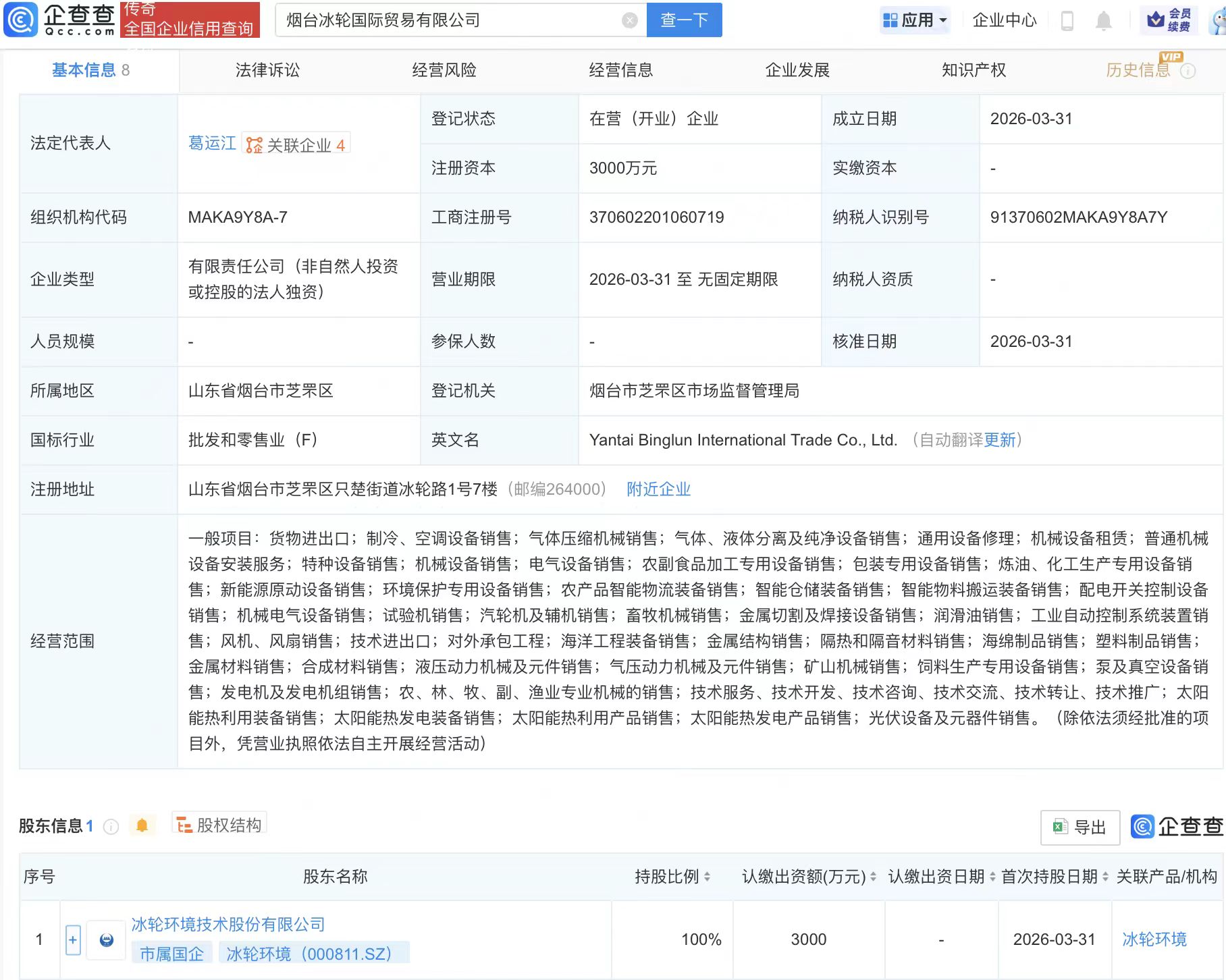 企查查APP显示,近日,烟台冰轮国际贸易有限公司成立,注册资本3000万元,经营范围包含:太阳能热发电装备销售;太阳能热利用产品销售;太阳能热发电产品销售;光伏设备及元器件销售等。企查查股权穿透显示,该公司由冰轮环境(000811)全资持股。
