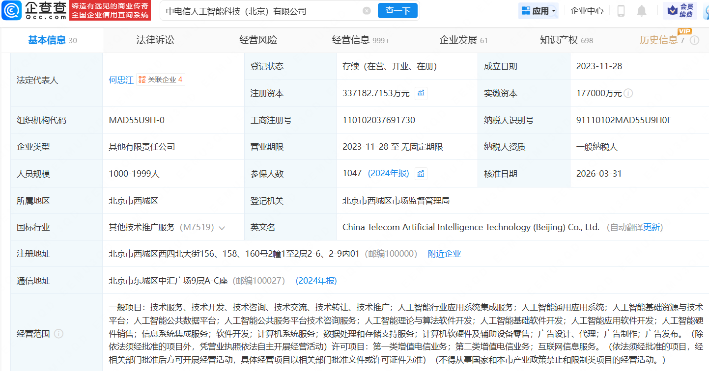 企查查APP显示,近日,中电信人工智能科技(北京)有限公司发生工商变更,新增国家人工智能产业投资基金合伙企业(有限合伙)、央视融媒体产业投资基金(有限合伙)、北京市人工智能产业投资基金(有限合伙)等为股东,同时注册资本由30亿元增至33.72亿元。企查查信息显示,该公司成立于2023年,经营范围包含:人工智能行业应用系统集成服务;人工智能通用应用系统;人工智能基础资源与技术平台;人工智能公共数据平台等。公开信息显示,中电信人工智能是中国电信开展人工智能业务的科技型、能力型、平台型专业公司。