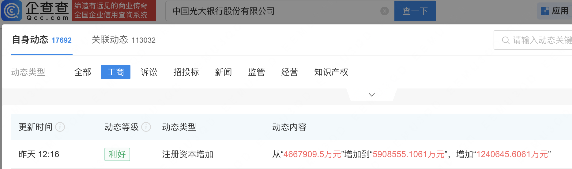 企查查APP显示,近日,光大银行(601818)发生工商变更,注册资本由约466.8亿人民币增至约590.9亿人民币。企查查信息显示,光大银行成立于1992年,法定代表人为吴利军,经营范围为银行业务,由中国光大集团股份公司、中信金融资产(02799.HK)等共同持股。