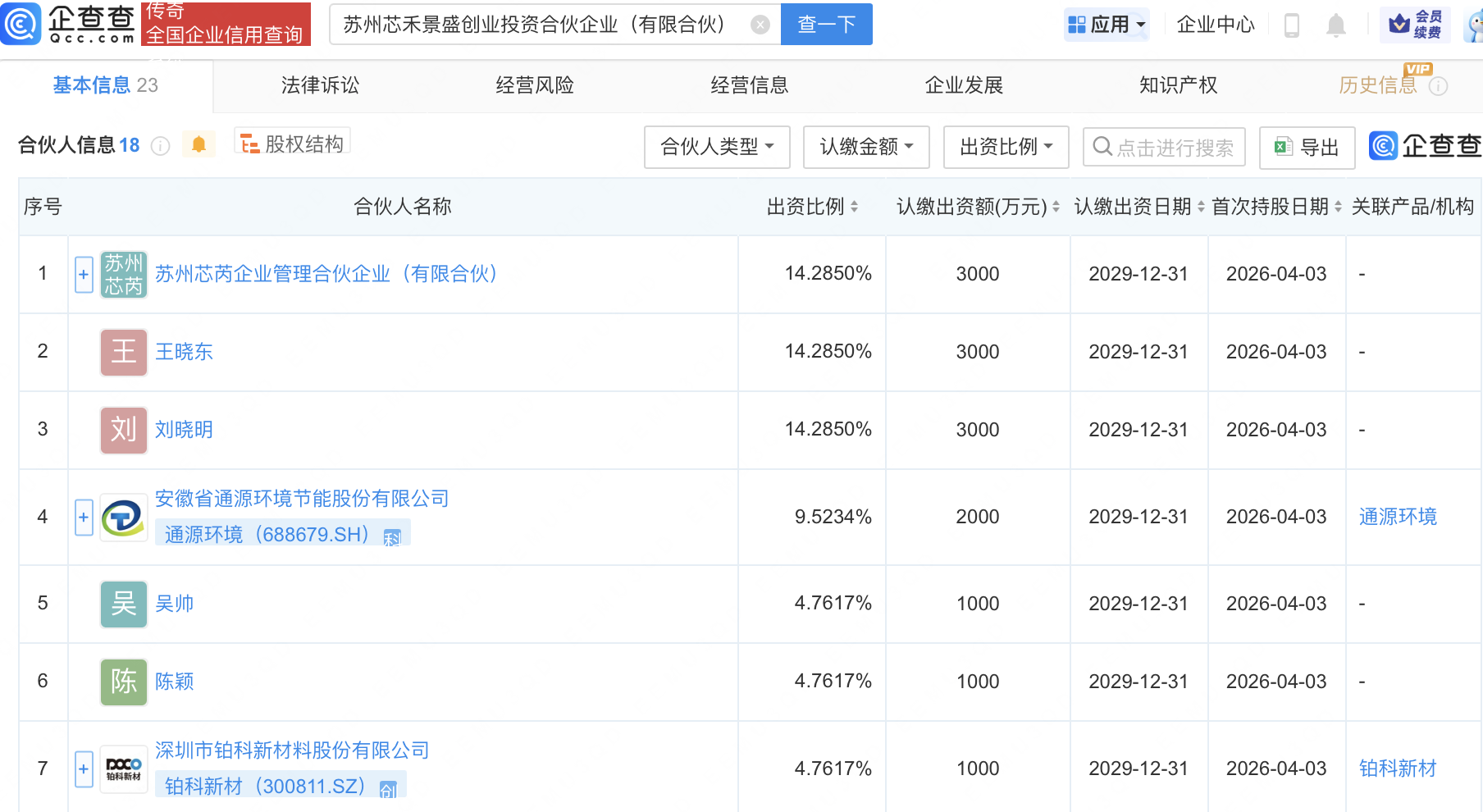 企查查APP显示,近日,苏州芯禾景盛创业投资合伙企业(有限合伙)成立,经营范围包含:创业投资(限投资未上市企业);以自有资金从事投资活动。企查查股权穿透显示,该企业由通源环境(688679)、铂科新材(300811)等共同出资。
