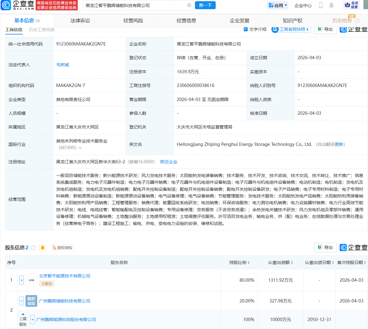 企查查APP显示,近日,黑龙江智平鹏辉储能科技有限公司成立,法定代表人为毛树威,注册资本为1639.9万元,经营范围包含:新兴能源技术研发;风力发电技术服务;太阳能热发电装备销售;电力电子元器件制造;电机制造等。企查查股权穿透显示,该公司由北京智平能源技术有限公司、鹏辉能源(300438)全资子公司广州鹏辉储能科技有限公司共同持股。