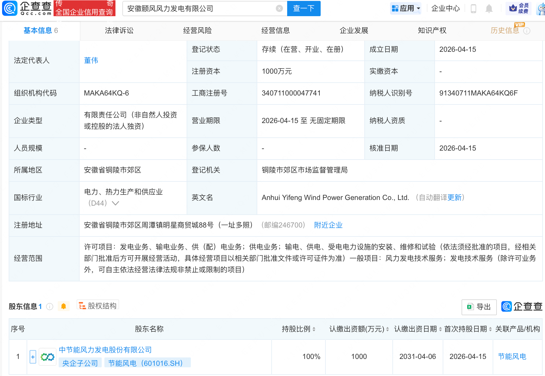 企查查APP显示,近日,安徽颐风风力发电有限公司成立,经营范围包含:发电业务、输电业务、供(配)电业务;供电业务;输电、供电、受电电力设施的安装、维修和试验等。企查查股权穿透显示,该公司由节能风电(601016)全资持股。