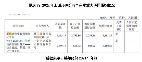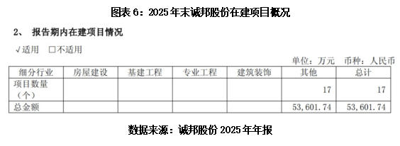 2025年年报显示,诚邦股份生态环境建设业务的在建项目合计17个,总金额为5.36亿元。不过,该公司并未披露具体的项目名称,仅在“在建重大项目情况”中披露了两项工程概况:下院建设项目景观绿化工程、WJ-J-2023-001号地块商住项目仿古建筑及景观绿化分包工程。