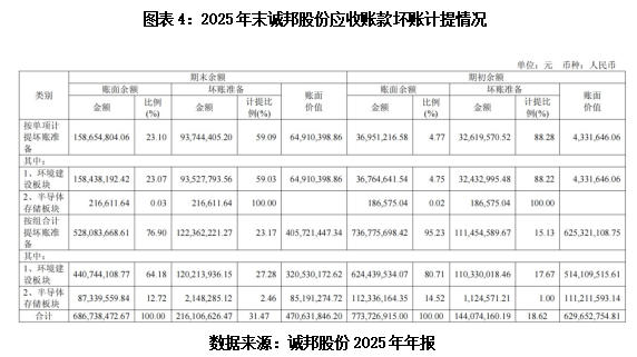 按业务板块拆分来看,无论是单项计提还是组合计提口径,生态环境建设板块均为诚邦股份应收账款减值损失的核心来源。数据显示,2025年末,诚邦股份应收账款单项计提中的99.86%、组合计提中的83.46%坏账准备均来自生态环境建设板块,反映主业回款风险高度集聚。