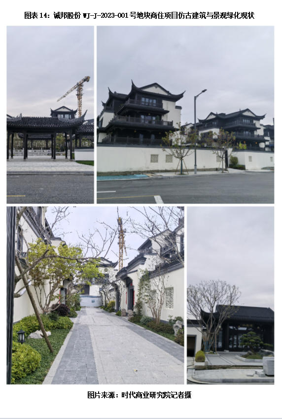 然而,记者现场探访发现,截至3月26日,该项目数量众多的建筑主体结构已全部完工,小青瓦屋面、铝代木构件、中式外立面装饰已施工完毕,飞檐翘角、花格门窗等中式元素完整呈现;小区道路、景观铺装、乔木种植已形成较为完整的现场效果,整体进入后期收尾阶段,其中10栋楼已有住户实际入住。