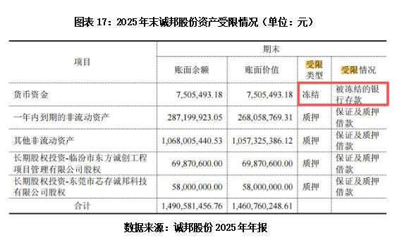 在资产端,诚邦股份的核心资产被大规模质押,可自由支配的资产空间被大幅压缩。年报显示,截至2025年年末,诚邦股份所有权受限资产的账面余额约为14.91亿元,账面价值为14.61亿元,占公司总资产的比例均超56%。其中,超10亿元为非流动资产,子公司芯存科技、临汾东方诚创的股权亦被用于质押融资。由此可见,该公司大部分核心资产已被用于融资担保,资产流动性较差。