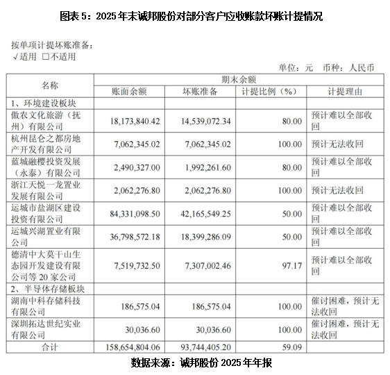 其中,诚邦股份对杭州昆仑之都房地产有限公司、浙江天悦一龙置业发展有限公司的应收账款100%全额计提坏账,预计无法收回;对傲农文化旅游(抚州)有限公司、蓝城融樱投资发展(永泰)有限公司的应收账款分别计提80%坏账,对运城市盐湖区建设投资有限公司、运城兴湖置业有限公司的应收账款分别计提50%坏账;对德清中大莫干山生态园开发建设有限公司等20家公司的应收账款计提97.17%坏账。此外,该公司半导体存储业务亦有两家客户的应收账款被100%计提坏账,预计无法收回。