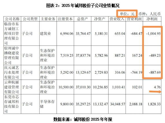 2025年年报显示,诚邦股份5家子公司中,除了跨界布局半导体的芯存科技实现盈利,其余4家子公司均聚焦建筑、生态建设,其中3家出现实质性亏损,剩余1家净利润仅为4.76元(财务报表单位疑似编制错误,或应为“万元”,截至目前该公司尚未发布相关更正公告),勉强徘徊在盈亏平衡线边缘。子公司层面的集体失血,成为诚邦股份生态环境建设业务整体业绩恶化的核心推手。