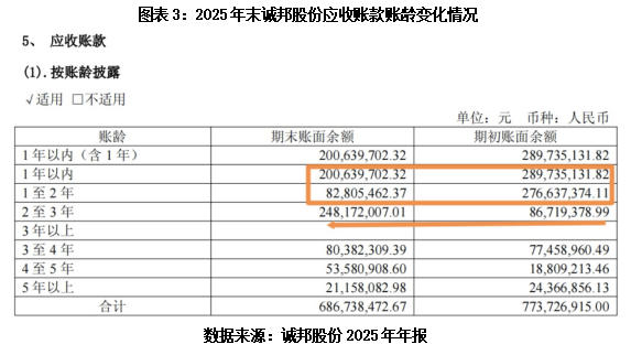 年报显示,从账龄结构看,截至2025年年末,诚邦股份的1年以内应收账款账面余额从年初的2.90亿元骤降至2.01亿元,1~2年应收账款账面余额从2.77亿元压缩至0.83亿元;与此同时,2~3年应收账款账面余额从0.87亿元暴增至2.48亿元,增幅高达186%,3~4年、4~5年应收账款账面余额亦同步攀升。