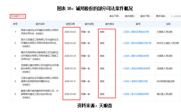除了债务压力,诚邦股份还面临涉诉事项频发的困境。据诚邦股份于2026年2月12日披露的公告,截至公告日,该公司累计涉及诉讼、仲裁事项的涉案金额合计6494.52万元,占公司最近一期经审计净资产绝对值的10.01%。天眼查数据显示,截至2026年3月31日,诚邦股份存在数量众多的司法案件,案由涵盖买卖合同纠纷、建设工程分包合同纠纷等。