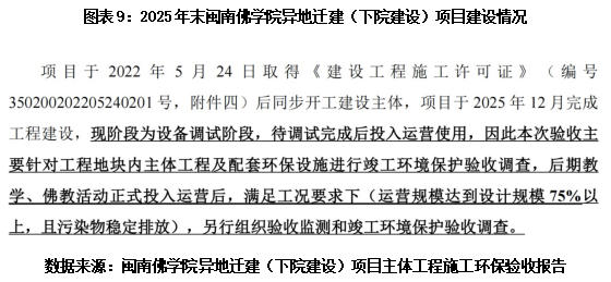 时代商业研究院获取到一份由厦门市南普陀寺委托出具、发布于2026年2月的《闽南佛学院异地迁建(下院建设)项目主体工程竣工环境保护验收报告》。根据该报告,闽南佛学院异地迁建(下院建设)项目主体工程于2025年12月方才建成,截至2025年末仍处于设备调试阶段,尚未投入运营,且本次验收仅覆盖主体建筑及环保设施,并不包含景观绿化工程。