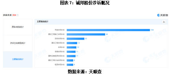 除了大额涉案金额,诚邦股份涉及的纠纷案件数量也较多,覆盖多个业务环节。天眼查显示,截至2026年3月29日,公司涉诉案件累计204起,案由涵盖买卖合同纠纷、建设工程施工合同纠纷、劳务合同纠纷等,其中买卖合同纠纷104起,为占比最高的涉诉案由。