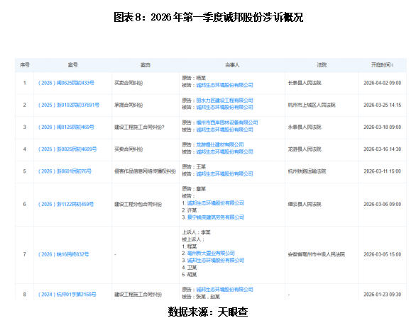 仅2026年3月,诚邦股份就有6则开庭公告。大量诉讼纠纷若最终败诉或需承担相关赔偿,可能会对该公司经营现金流造成影响,也可能进一步加剧公司经营的不确定性。