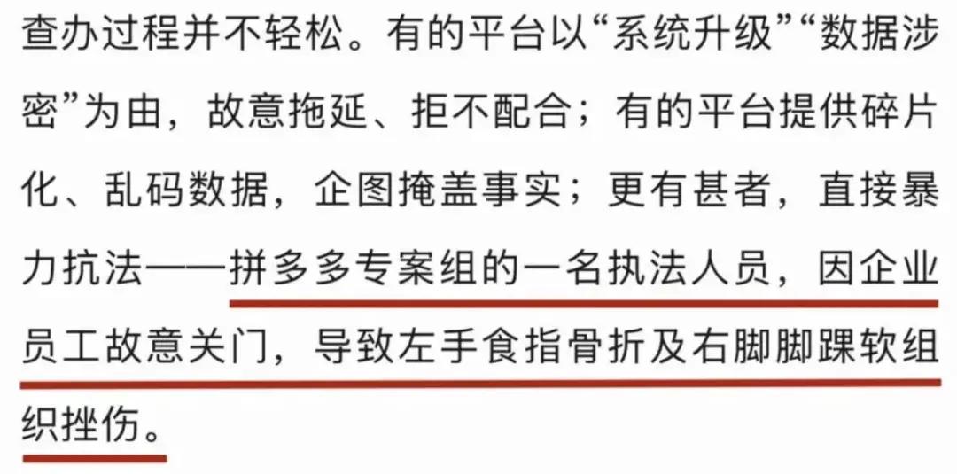 其中最为典型的是本分电商多多,直接暴力抗法——拼多多专案组的一名执法人员,因企业员工故意关门,导致左手食指骨折及右脚脚踝软组织挫伤。