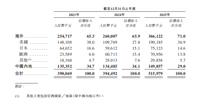 当你打开XREAL 的业务版图,这个问题就迎刃而解了。2025 年公司海外收入占比高达 71%,销售网络覆盖全球 40 个国家和地区。XREAL 本质上是一家 “中国研发、全球销售” 的科技出海企业,并且 XREAL 在海外并非简单依靠代理商铺货,而是亲力亲为,在北美、日本、韩国等地均设立了本地化销售与运营团队,由此承担了当地人员薪酬、办公场地租赁等大量固定成本,这也直接解释了其营销及行政开支居高不下的原因。