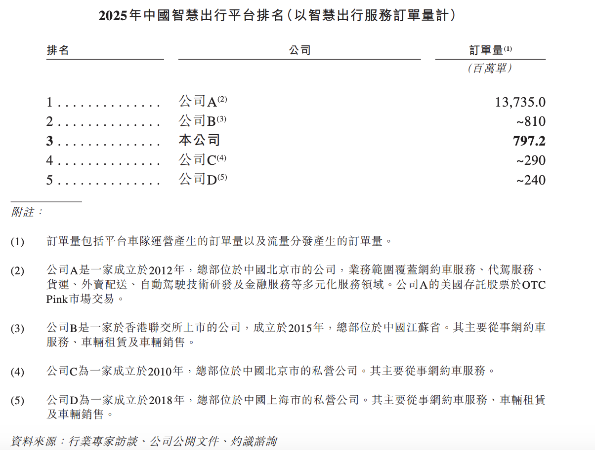 按2025年订单量计,T3出行是中国第三大智慧出行平台,结合招股书中披露的市场份额和企业信息判断,排在前一、二名的则是滴滴和曹操出行。