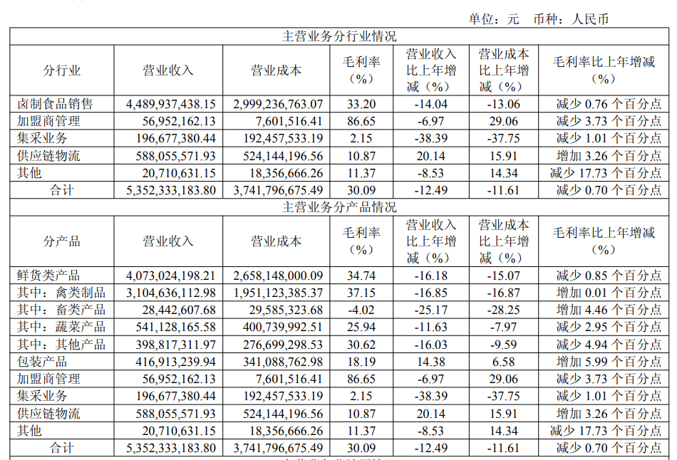 财报显示,2025年公司卤制食品销售业务实现营收44.9亿元,同比下滑14.04%,占总营收比重超80%。其中核心的禽类制品营收同比下滑16.85%,远超整体营收降幅。