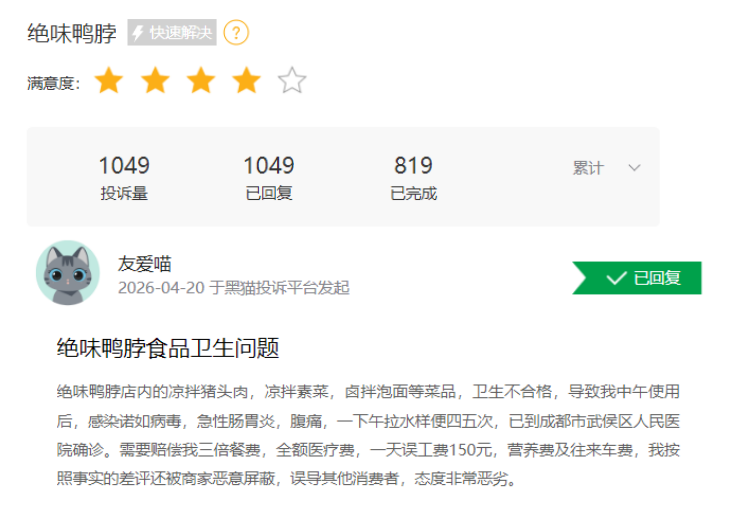 在黑猫投诉平台上,关于绝味食品的投诉超过了1000条,多数集中在食品卫生方面。