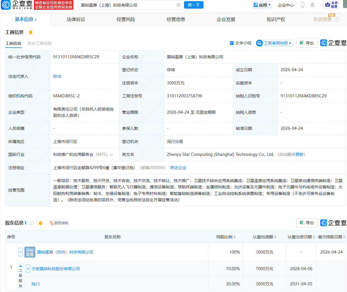 企查查APP显示,近日,震裕星算(上海)科技有限公司成立,法定代表人为陈浩,注册资本为3000万元,经营范围包含:卫星技术综合应用系统集成;卫星遥感应用系统集成;卫星移动通信终端制造;卫星遥感数据处理等。企查查股权穿透显示,该公司由震裕科技(300953)旗下震裕星算(苏州)科技有限公司全资持股。