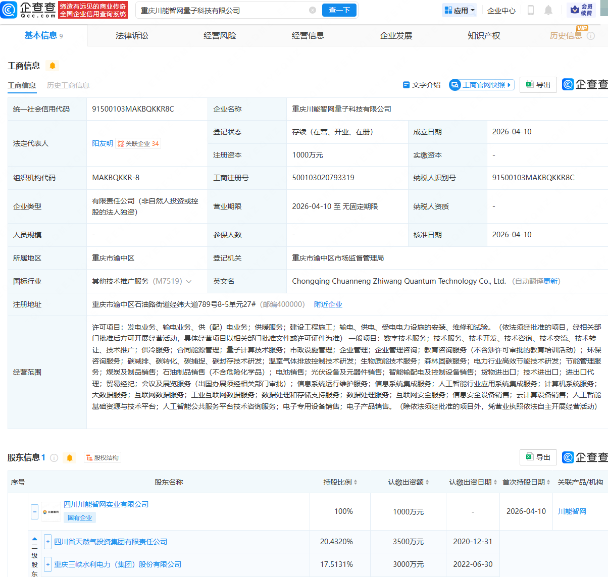 企查查APP显示,近日,重庆川能智网量子科技有限公司成立,法定代表人为阳友明,注册资本为1000万元,经营范围包含:量子计算技术服务;人工智能行业应用系统集成服务;计算机系统服务;大数据服务;互联网数据服务等。企查查股权穿透显示,该公司由四川川能智网实业有限公司全资持股,后者由四川省天然气投资集团有限责任公司、三峡水利(600116)等共同持股。