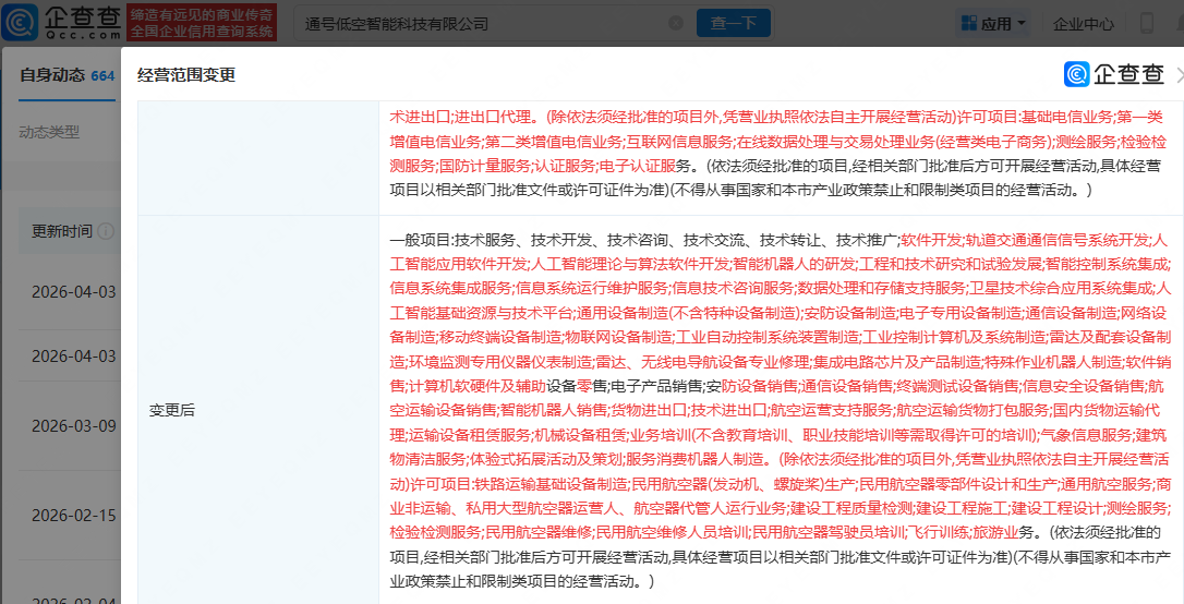 企查查APP显示,近日,通号低空智能科技有限公司发生工商变更,注册资本由3亿元增加至8亿元,增幅约为166.67%;同时经营范围变更为:人工智能应用软件开发;人工智能理论与算法软件开发;智能机器人的研发;卫星技术综合应用系统集成等。