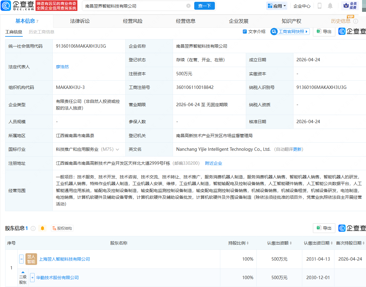 企查查APP显示,近日,南昌翌界智能科技有限公司成立,法定代表人为廖浩然,经营范围包含:服务消费机器人制造,服务消费机器人销售,智能机器人销售,智能机器人的研发,工业机器人销售等。企查查股权穿透显示,该公司由华勤技术(603296)间接全资持股。