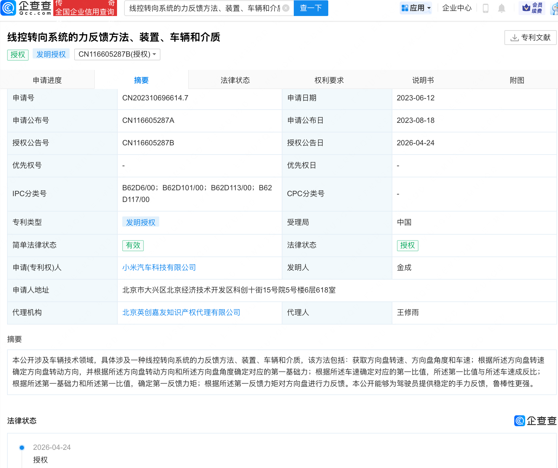 企查查APP显示,近日,小米汽车科技有限公司申请的“线控转向系统的力反馈方法、装置、车辆和介质”获授权。企查查专利摘要显示,本公开涉及车辆技术领域,该方法包括:获取方向盘转速、方向盘角度和车速;根据所述方向盘转速确定方向盘转动方向,并根据所述方向盘转动方向和所述方向盘角度确定对应的第一基础力;根据所述车速确定对应的第一比值,所述第一比值与所述车速成反比;根据所述第一基础力和所述第一比值,确定第一反馈力矩;根据所述第一反馈力矩对方向盘进行力反馈。本公开能够为驾驶员提供稳定的手力反馈,鲁棒性更强。