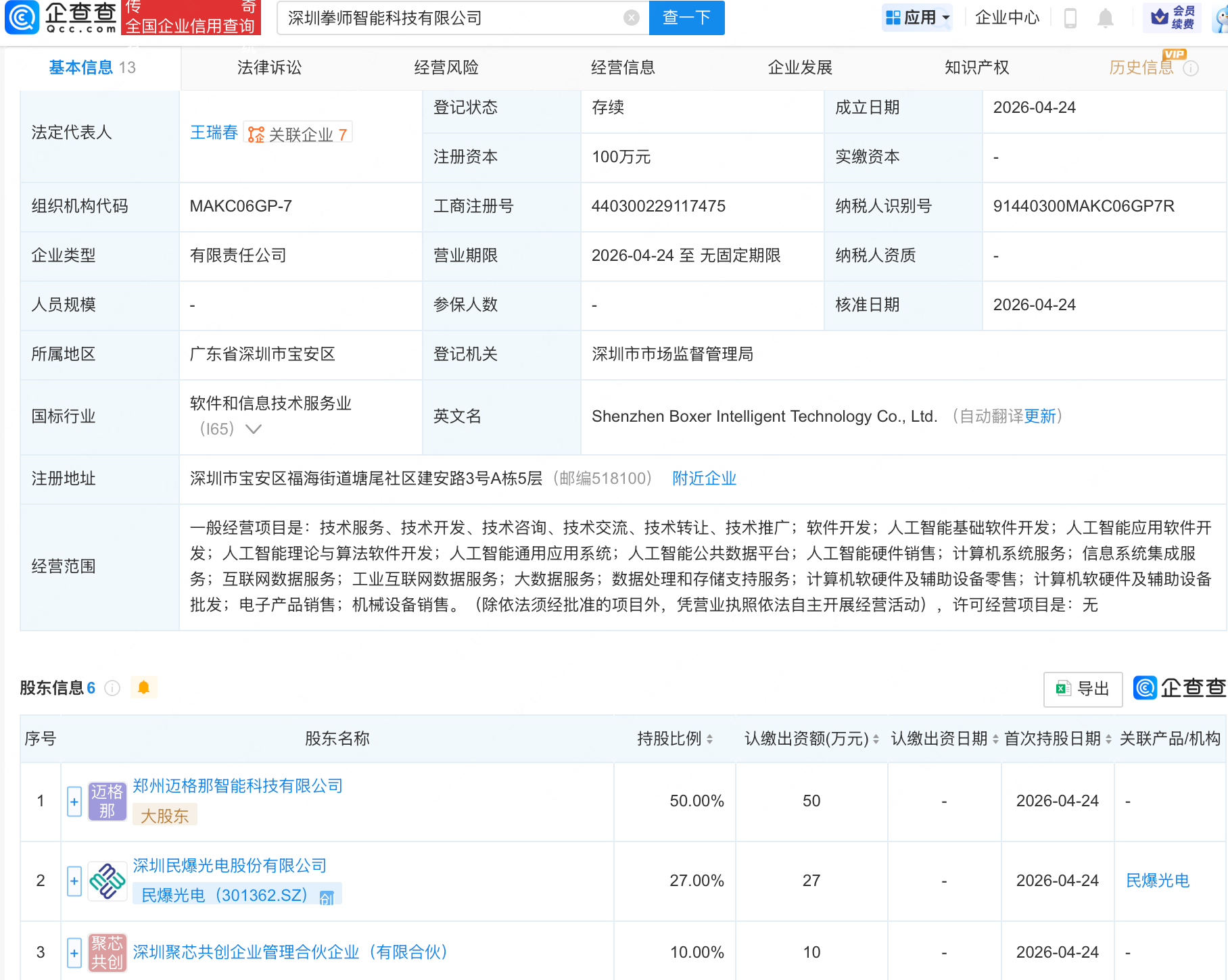 企查查APP显示,近日,深圳拳师智能科技有限公司成立,经营范围包含:人工智能基础软件开发;人工智能应用软件开发;人工智能理论与算法软件开发;人工智能通用应用系统;人工智能公共数据平台等。企查查股权穿透显示,该公司由民爆光电(301362)等共同持股。