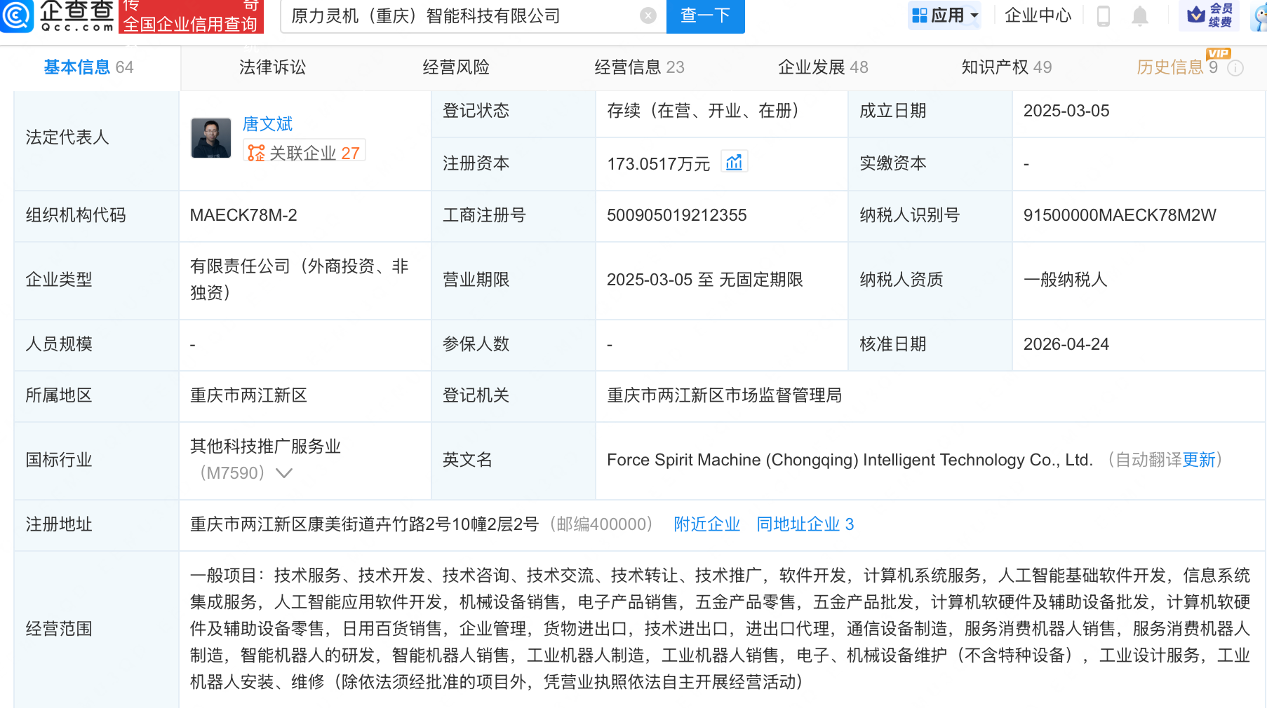 企查查APP显示,近日,原力灵机(重庆)智能科技有限公司发生工商变更,新增华勤技术(603296)全资子公司上海摩勤智能技术有限公司等为股东,同时注册资本增至173.05万元。企查查信息显示,该公司成立于2025年3月,经营范围包含:人工智能基础软件开发,人工智能应用软件开发,智能机器人的研发,智能机器人销售等。公开信息显示,原力灵机是一家具身智能科技公司。