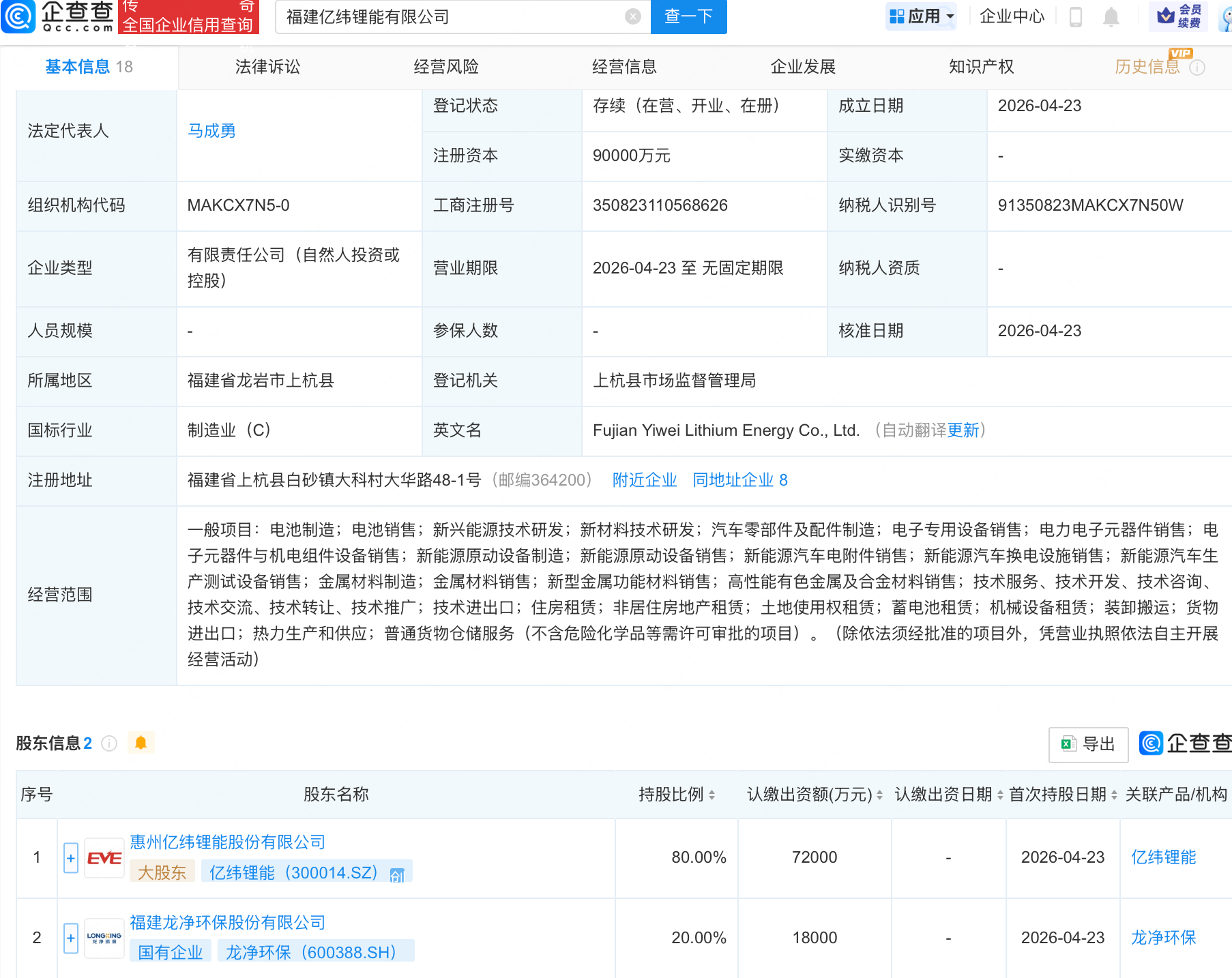 企查查APP显示,近日,福建亿纬锂能有限公司成立,注册资本9亿元,经营范围包含:电池制造;电池销售;新兴能源技术研发;新材料技术研发;汽车零部件及配件制造等。企查查股权穿透显示,该公司由亿纬锂能(300014)、龙净环保(600388)共同持股。