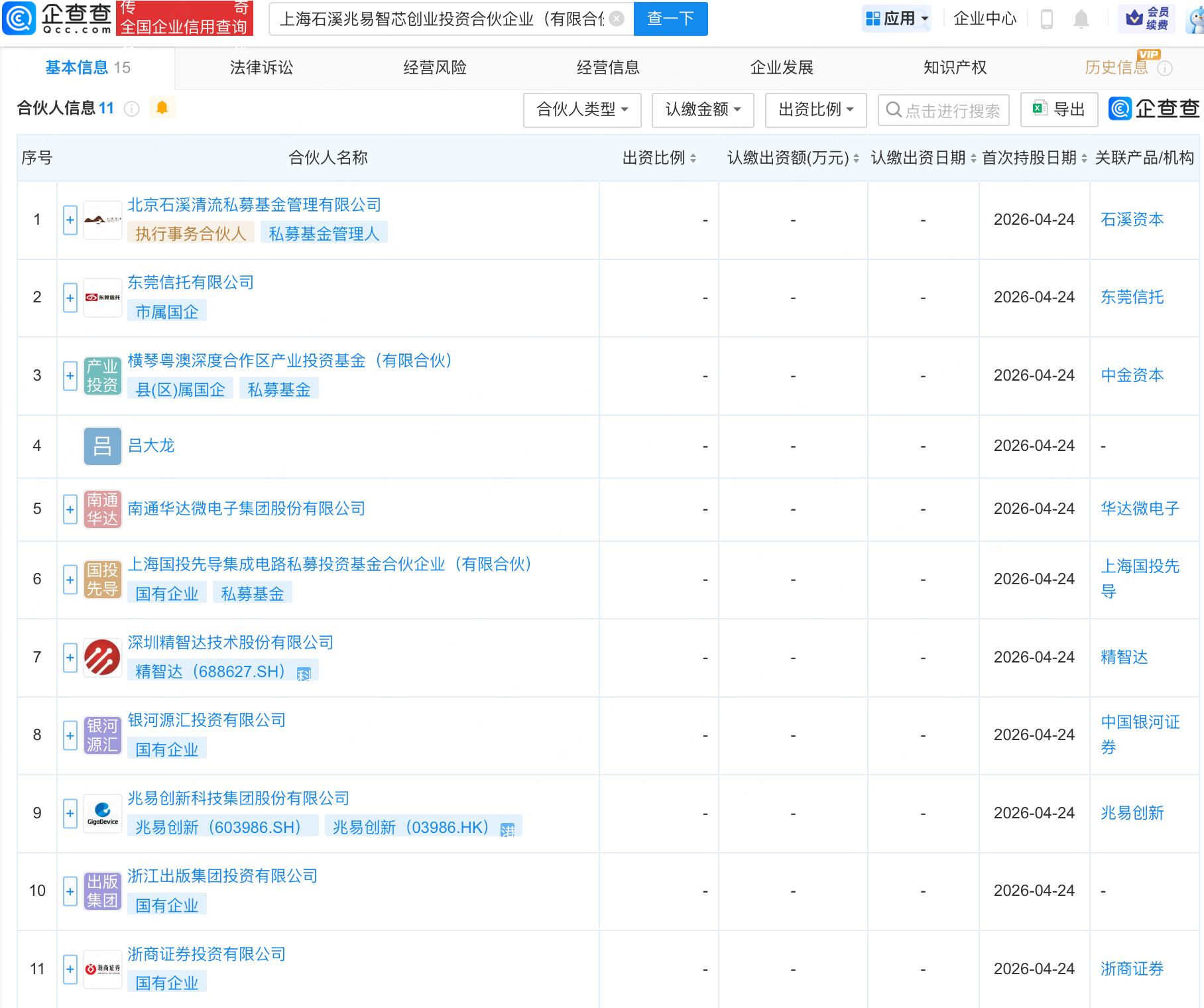 企查查APP显示,近日,上海石溪兆易智芯创业投资合伙企业(有限合伙)成立,出资额15.46亿元,经营范围包含:创业投资(限投资未上市企业)。企查查股权穿透显示,该企业由精智达(688627)、兆易创新(603986)等共同出资。