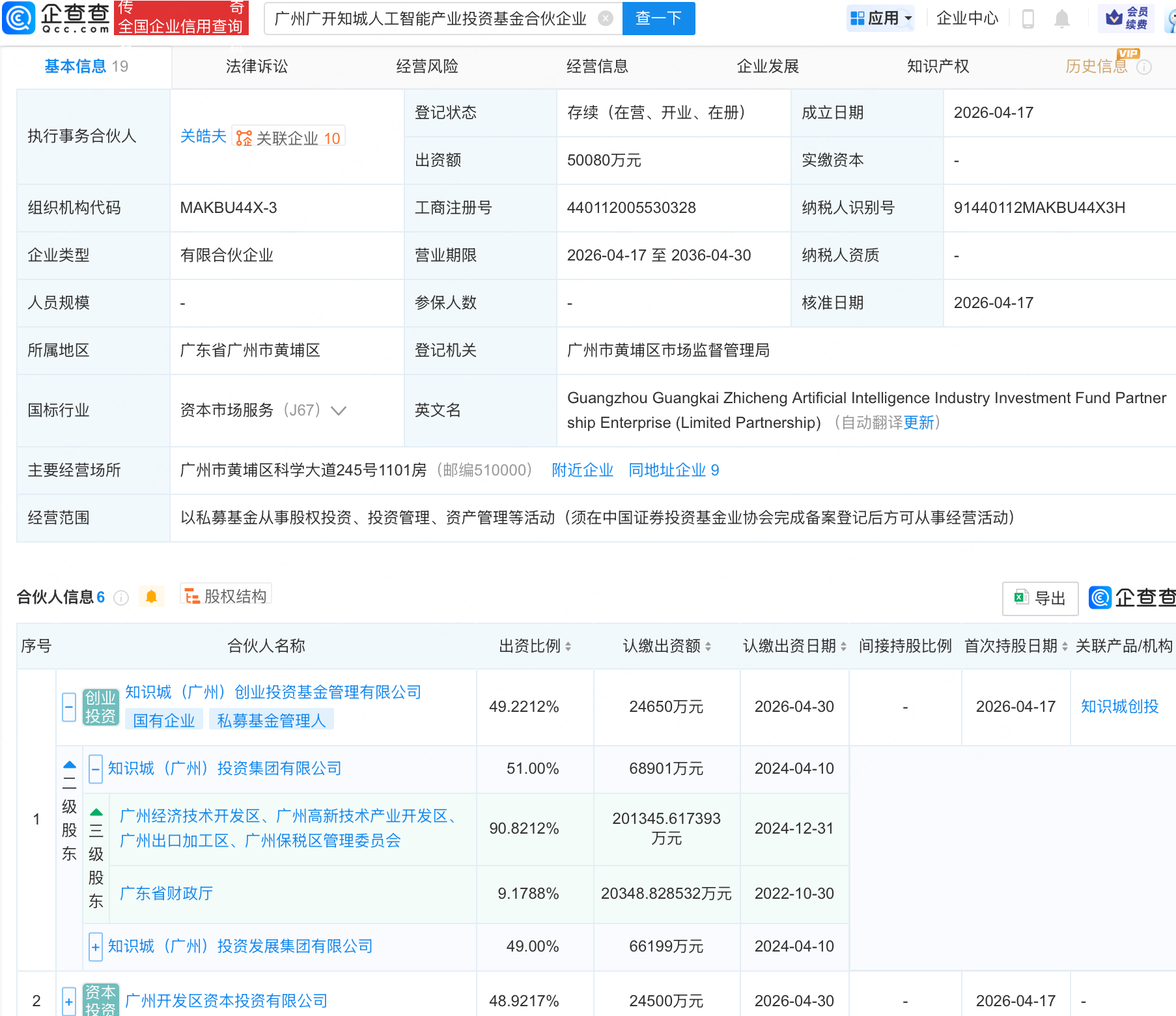 企查查APP显示,近日,广州广开知城人工智能产业投资基金合伙企业(有限合伙)成立,出资额约5亿元,经营范围包含:以私募基金从事股权投资、投资管理、资产管理等活动。企查查股权穿透显示,该企业由知识城(广州)创业投资基金管理有限公司等共同出资。