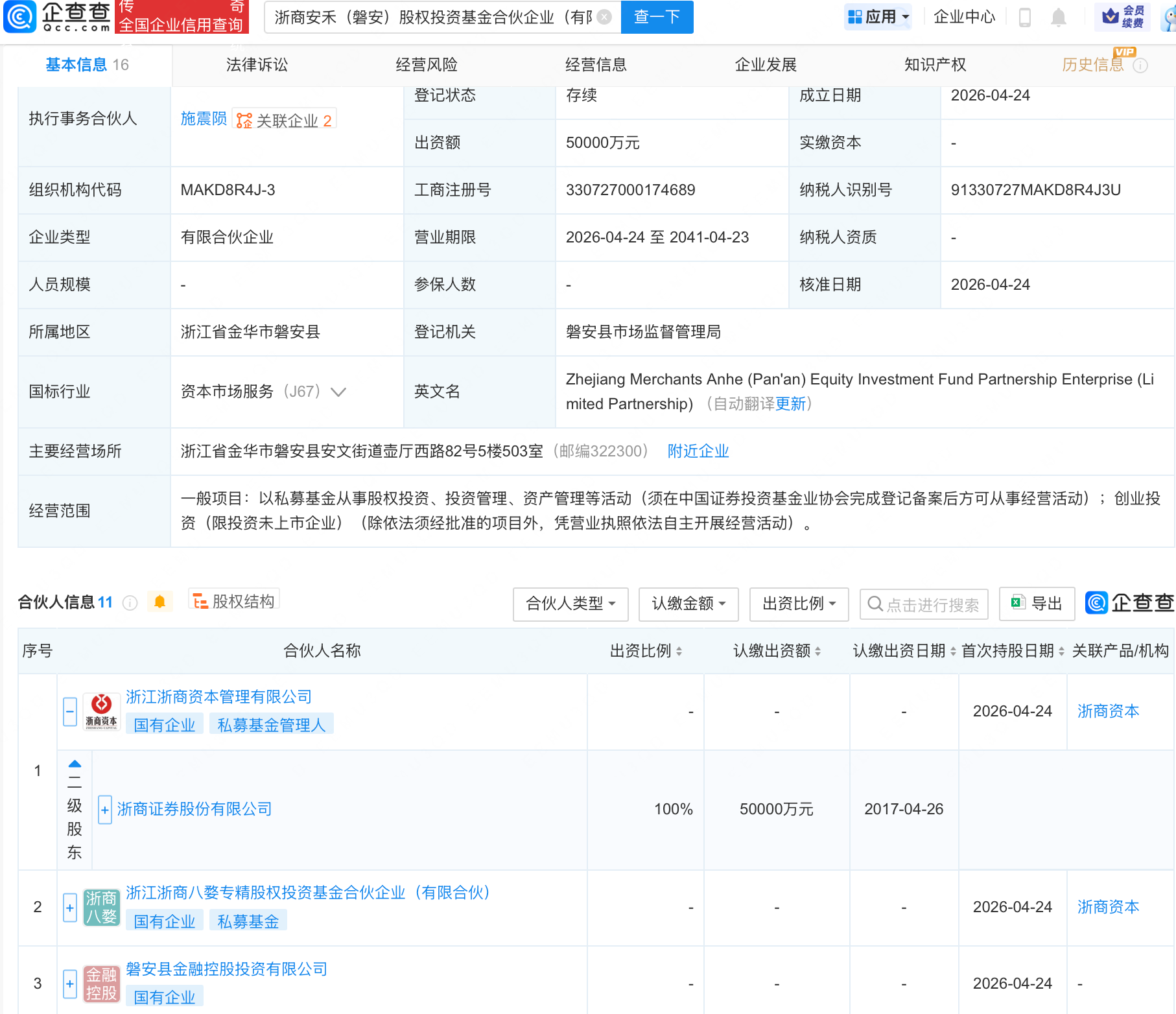 企查查APP显示,近日,浙商安禾(磐安)股权投资基金合伙企业(有限合伙)成立,经营范围包含:以私募基金从事股权投资、投资管理、资产管理等活动。企查查股权穿透显示,该企业由浙商证券(601878)全资子公司浙江浙商资本管理有限公司等共同出资。
