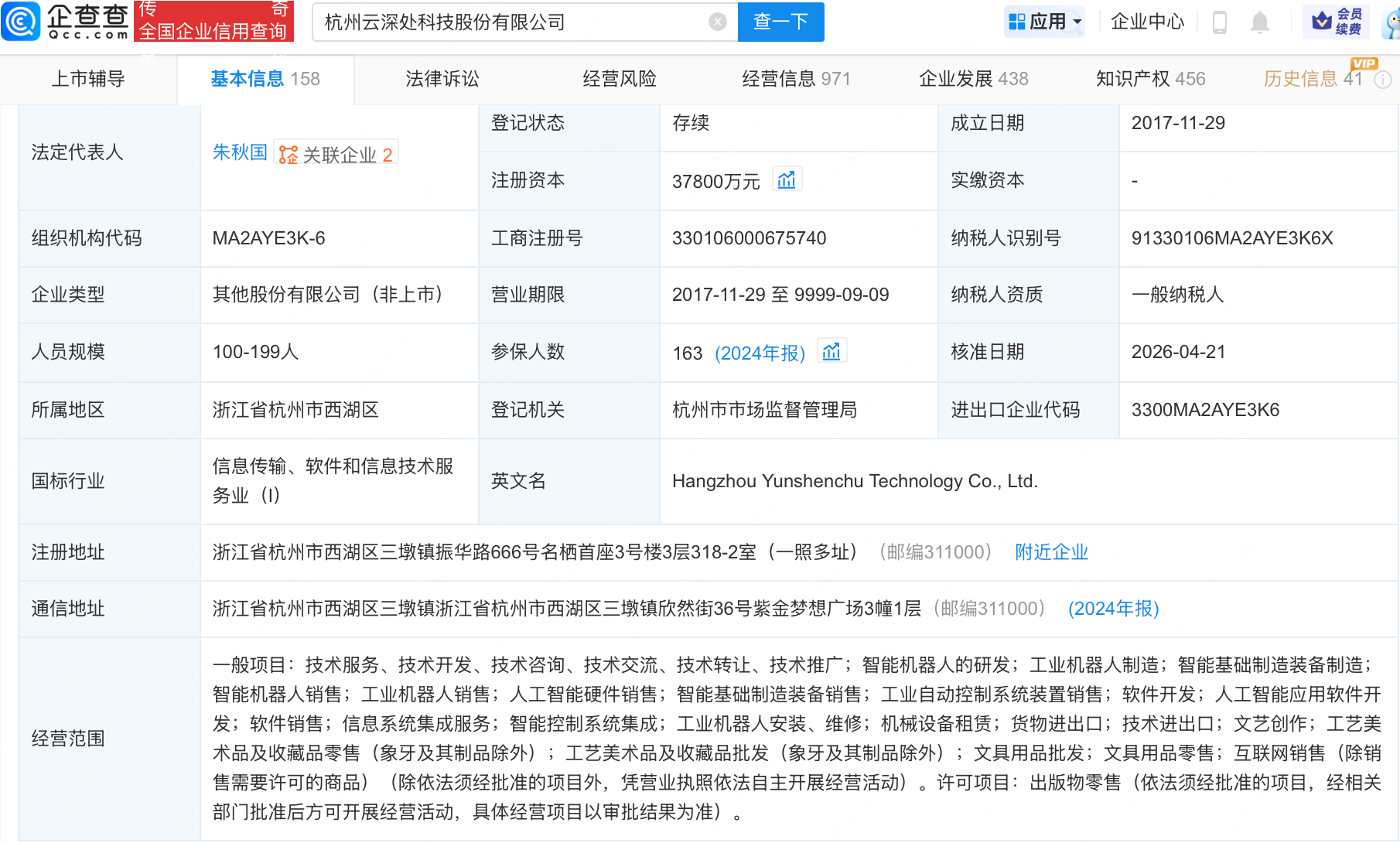 企查查APP显示,近日,杭州云深处科技股份有限公司发生工商变更,经营范围新增文艺创作、工艺美术品及收藏品零售(象牙及其制品除外)、工艺美术品及收藏品批发(象牙及其制品除外)等,同时主要人员发生变更。企查查信息显示,该公司成立于2017年,注册资本3.78亿元。
