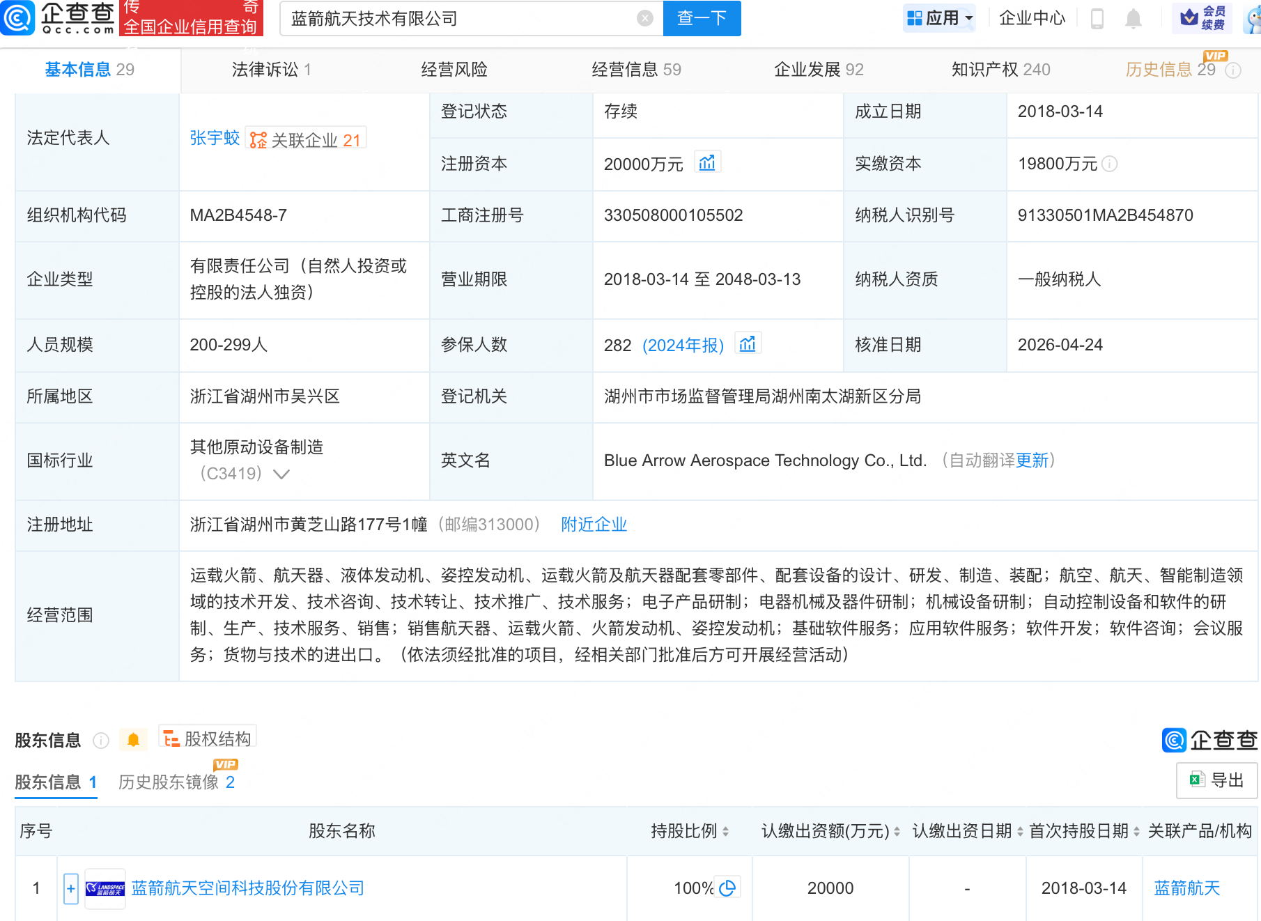企查查APP显示,近日,蓝箭航天技术有限公司发生工商变更,注册资本由1.98亿元增至2亿元。企查查信息显示,该公司成立于2018年,经营范围包含:运载火箭、航天器、液体发动机、姿控发动机、运载火箭及航天器配套零部件、配套设备的设计等,由蓝箭航天空间科技股份有限公司全资持股。