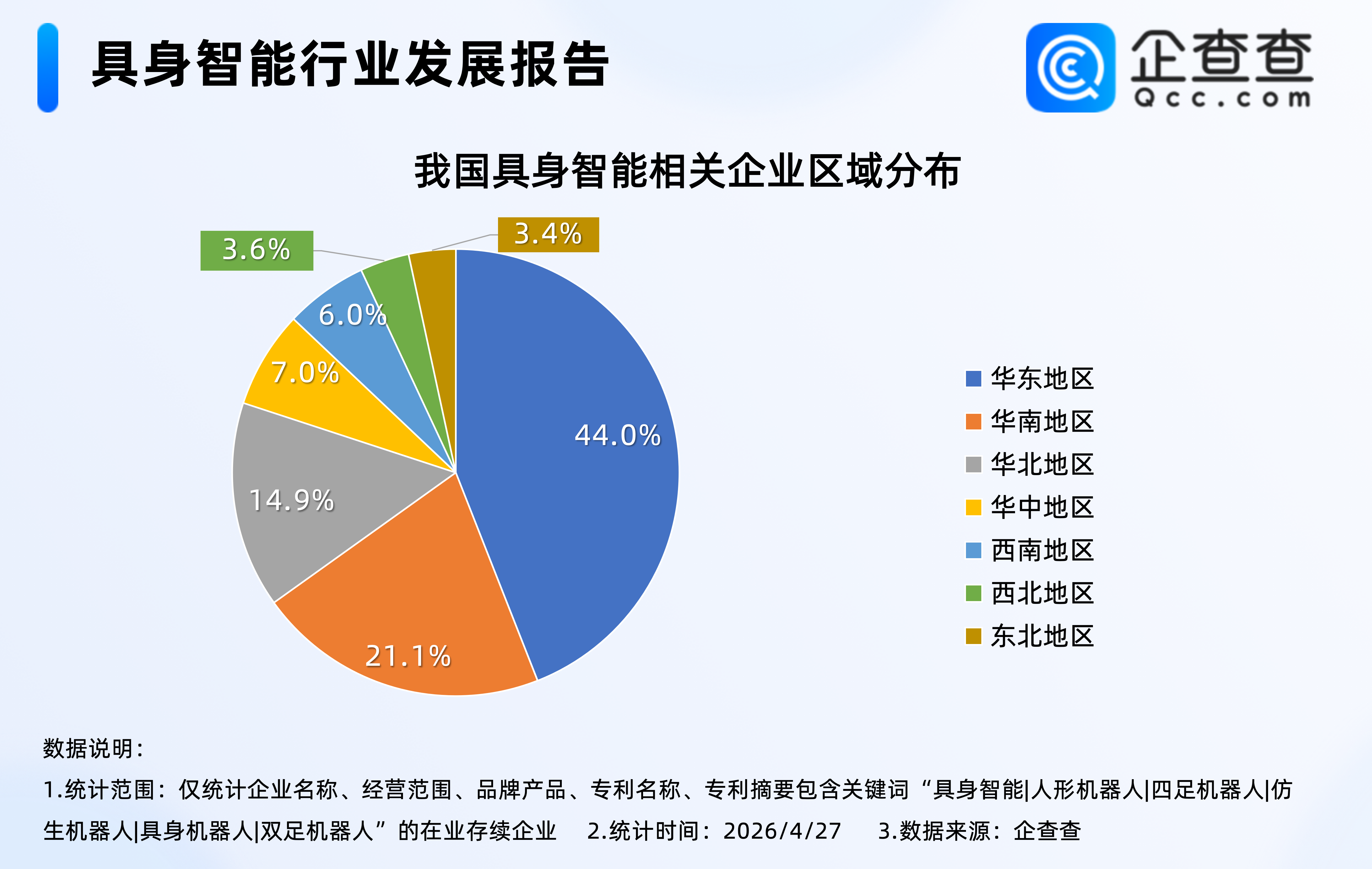 企查查数据显示,2021年以来,我国具身智能相关企业每年注册量基本逐年增加,2025年全年,我国具身智能相关企业注册量同比大幅增加115.6%至388家,达近五年注册量及其增速双高峰。企业存量方面,截至2026年4月27日,我国现存2861家具身智能相关企业;区域分布上华东地区最多,占比达44.0%,其次是华南地区,占比21.1%。
