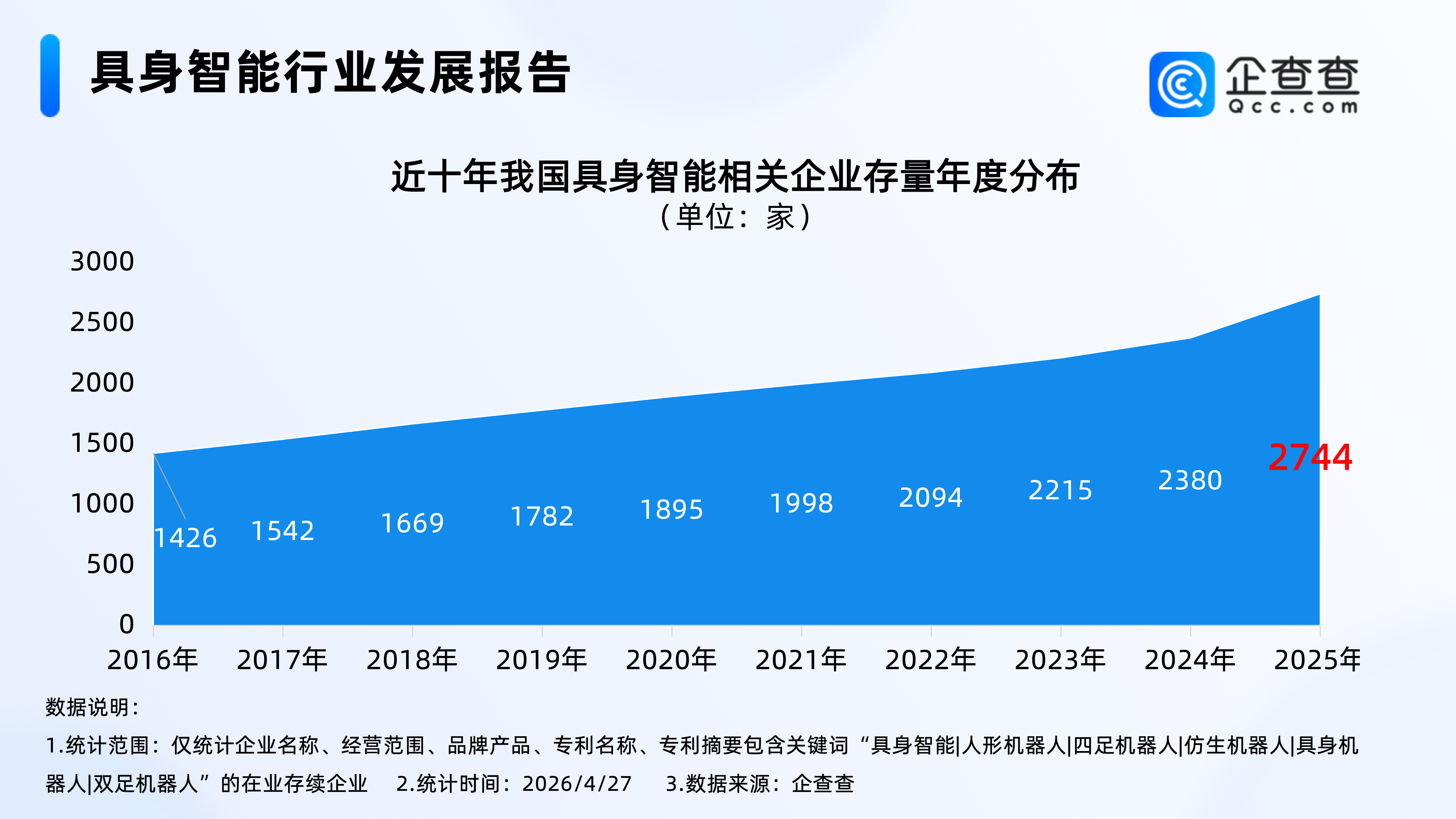 企查查数据显示,近十年,我国具身智能相关企业存量逐年稳定增加,截至2025年年底,我国在业存续2744家具身智能相关企业。截至2026年4月27日,我国现存2861家具身智能相关企业。