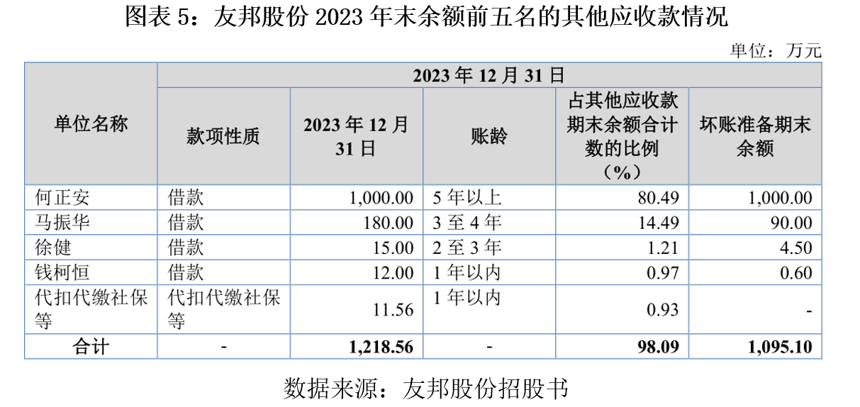 招股书及问询函披露,截至2023年末,友邦股份对何正安、马振华两人的其他应收款账面余额分别为1000万元、180万元,性质为借款。其中对何正安的借款按100%计提坏账准备,对马振华的借款按50%计提坏账准备,计提坏账金额合计达1090万元。