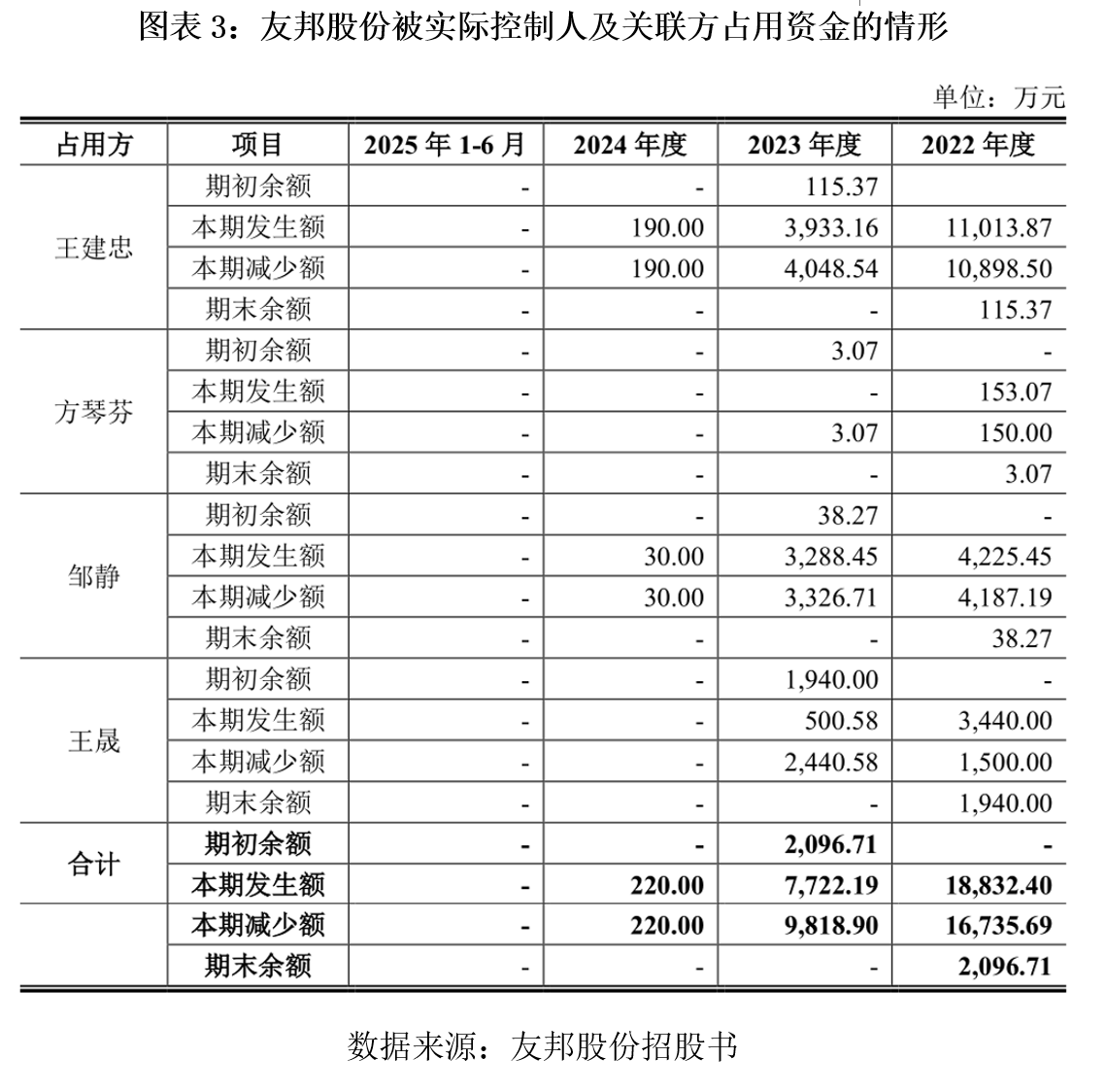 招股书及问询函显示,报告期内,友邦股份存在被实际控制人及其关联方占用资金的情形,涉及人员包括三名共同实际控制人王建忠、王晟(王建忠之子)、方琴芬(王建忠之配偶),以及彼时的财务经理邹静(现任友邦股份内审负责人)。