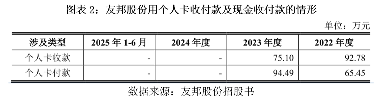招股书显示,2022—2023年,友邦股份个人卡收款金额分别为92.78万元、75.10万元,占当期营业收入的比例分别为0.40%、0.27%;个人卡付款金额分别为65.45万元、94.49万元,占当期营业成本的比例分别为0.40%、0.50%,占比虽低,但违规性质明确。