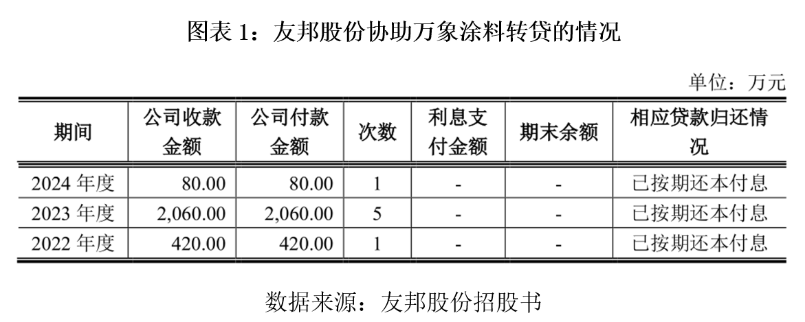 根据招股书,报告期内,友邦股份与万象涂料累计发生转贷往来7笔,协助转贷金额合计达2560万元,其中2023年密集实施了5笔,合计金额2060万元。